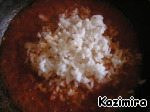 Размягченную сердцевину выкладываем в сковороду, солим, перчим и тушим на маленьком огне до выпаривания жидкости. Добавляем отваренный заранее рис.