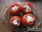 Смешиваем все - начинка готова. Фаршируем ею помидоры. Посыпаем сверху соленым творогом.