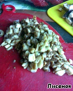 Сверху на грибы выложить мякоть баклажанов и посыпать солью и смесью перцев.