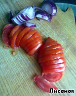 Лук очистить и нарезать полукольцами. Так же нарезать помидоры.