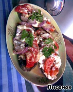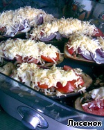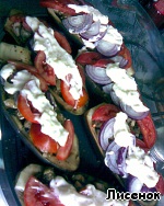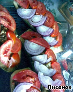 Сверху на одну половину баклажанов выложить полукольца помидоров, на вторую - полукольца лука.