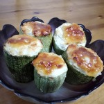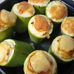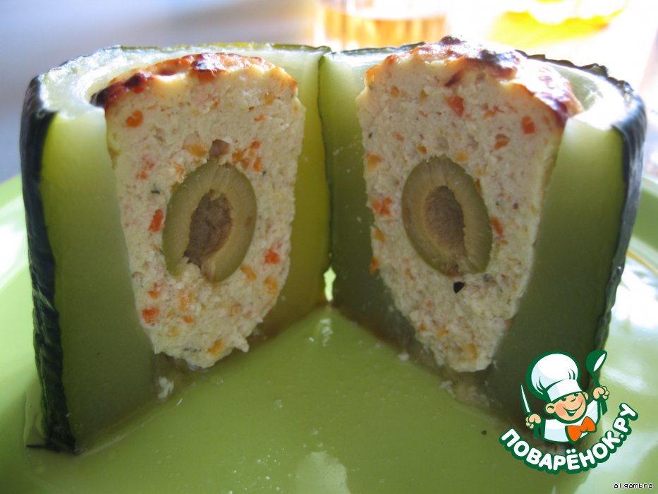 Из кабачков выливаем выделившийся сок, заполняем наполовину нашей курино-сырной массой и фаршируем оливкой или маслиной.