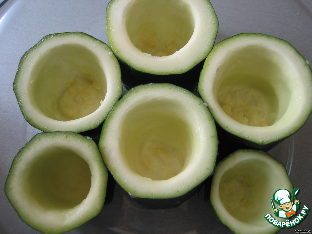 Кабачок помыть и порезать на \'пенёчки\' высотой примерно 6-7 см. Чайной ложкой извлечь сердцевину, посыпать солью и оставить минут на 15, пока готовим начинку.