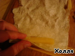 Нарезаем сыр брусочками. Разрезаем лаваш на прямоугольники с одной из сторон, равной длине брусочка сыра, но это не обязательно, можно брать размер прямоугольников лаваша чуть больше, главное, чтобы сыр не вытек в сковороду и дождался вытекания Вам в рот :)