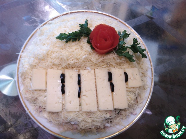 Седьмой слой - тертый яичный белок. Из сыра делаем имитацию белых клавиш, из маслин-черных клавиш. Из помидорки и петрушки делаем цветы.