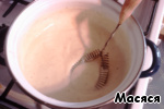 Влить муку к молоку с сахаром, добавить яйцо и варить постоянно помешивая, пока смесь не загустеет.