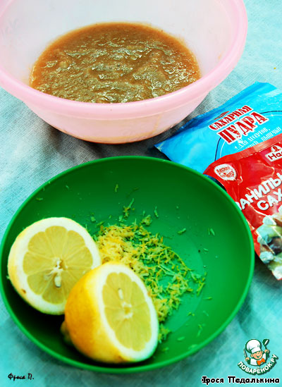 Соединить фруктовое пюре, лимонный сок, цедру, сахарную пудру, ванильный сахар. Сахарной пудры можно положить побольше, начинка получилось кисленькой из-за лимона.