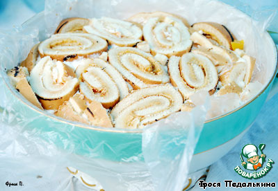 Накрыть оставшимися рулетами, пищевой пленкой и убрать для застывания в холодильник, лучше на ночь.