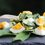Вымыть листья черемши и огурец. Сварить яйца. Очистить.