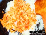 После того, как лук размягчится, добавить сладкий перец и немного перца чили. Посыпать овощи сладкой паприкой.