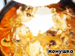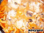 Затем вернуть на сковороду овощи и залить все теплым бульоном. Сверху выложить шампиньоны и оставить блюдо тушиться на полчаса.