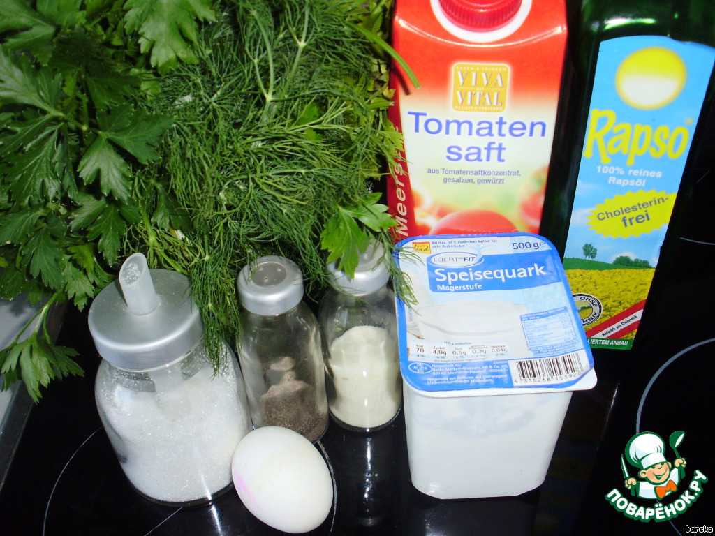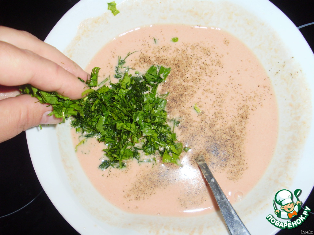 • Перетереть творог с томатным соком до однородной массы. Если творог домашний, то - через сито. Если томатный сок собственного приготовления, непастеризированный, то - прокипятить, как минимум, 10 минут!