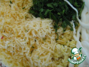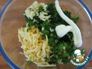 Сыр натереть на крупной тёрке. Измельчить зелень и чеснок. Заправить майонезом.