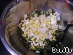 Нарезать или порвать руками листья шпината. Лук и отваренные яйца мелко порезать. Фету (125г) раскрошить. -