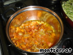Добавляем очищенные помидоры, вино и протушиваем до готовности, добавляем специи, базилик.
