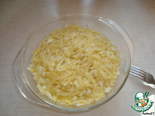 Смешать рыбу и половину лука. Посолить, поперчить. Выложить в форму, подходящую для СВЧ.