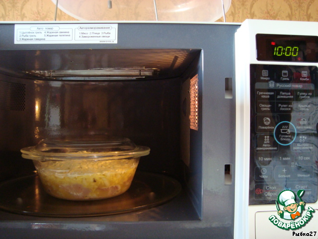 Готовить под крышкой в микроволновке 10 мин. при полной мощности, а затем поставить под гриль на 5 мин.