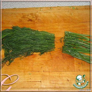 У укропа я, как всегда, отрезаю "хвостики", их замораживаю для бульона, зелень мелко рублю. Чеснок мелко режу.