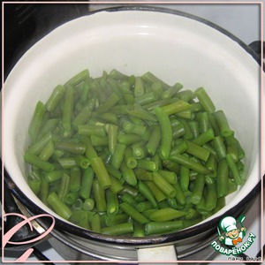 Закинуть в кипящую, хорошо подсоленную воду, варить недолго, до тех пор, пока фасолинки не станут мягкими (пробую ножом), но не потеряют ни цвета, ни формы.