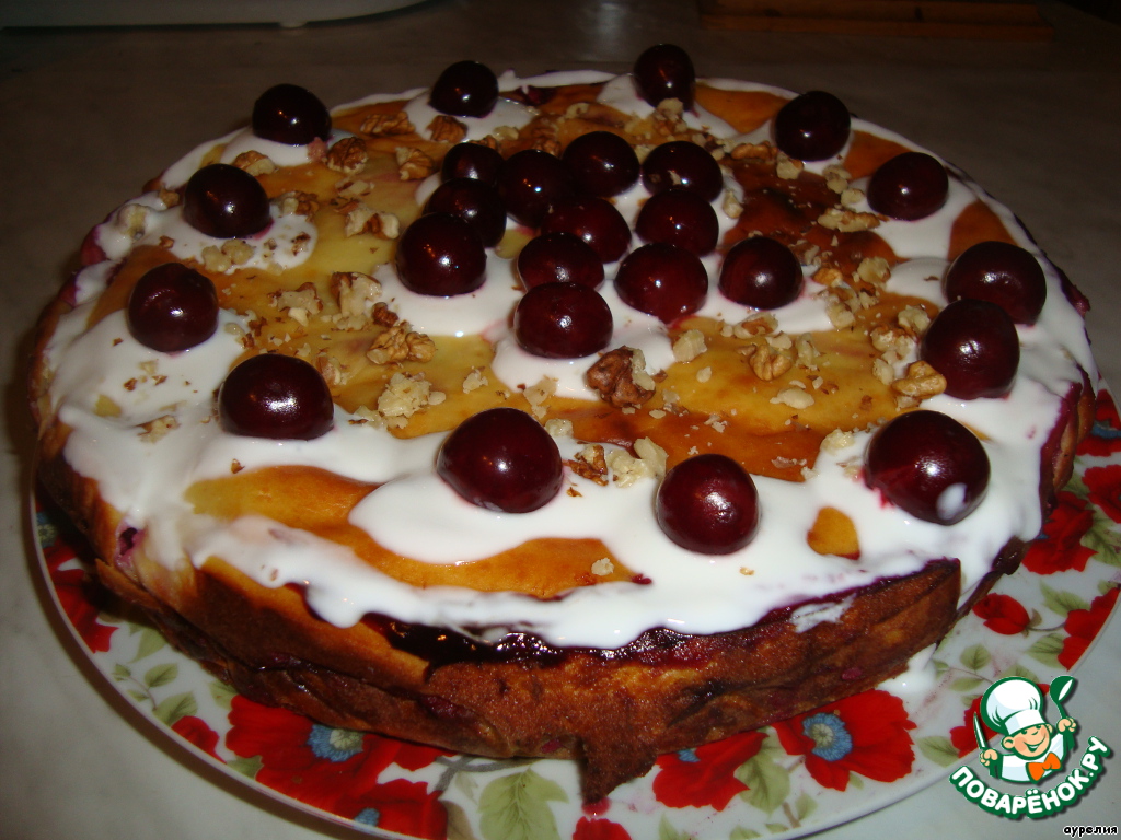 Поставить в духовку, разогретую до 180С. Выпекать до румяной корочки 50-55 мин, возможно понадобится и больше. Остужаем, освобождаем от формы и приступаем к украшению. У кого имеются сливки, тот их взбивает и выдавливает по своему усмотрению выбрав рисунок, а у кого нет, тот, как я, может украсить сметаной. Вишенка, которая на поверхности пирога, с косточками.