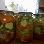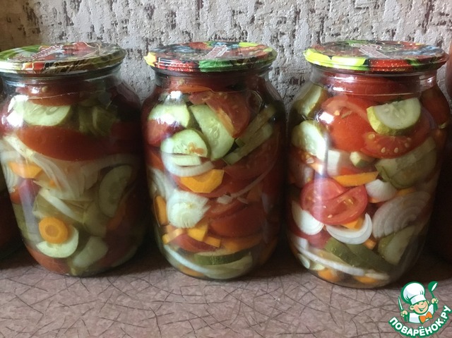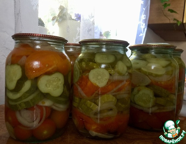 Далее слоями уложить помидоры, нарезанные дольками, огурцы и лук, нарезанные кольцами. Залить кипящим маринадом, накрыть прокипяченными крышками. Стерилизовать 15 минут.