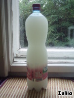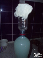 Когда вода остынет до комнатной температуры добавить дрожжи и сахар, тщательно размешать и оставить до появления пузырьков (на несколько часов). Когда на поверхности начнут появляться мелкие пузырьки жидкость процедить и разлить в пластиковые бутылки. Конструкция на фото - импровизированная цедилка. Лейки у меня нет, мелкого сита тоже, поэтому я приспособила вместо них свой кондитерский шприц и бинт в несколько слоёв.