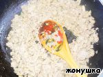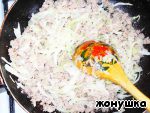 На сковороду наливаем растительное масло и тушим фарш, солим, перчим, добавляем мелко нарезанный лук.