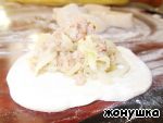 Тесто разрезаем на три части, каждую из которых скручиваем "колбаской" и режем на кусочки где-то по 5см. Каждый кусочек раскатываем тоненько.