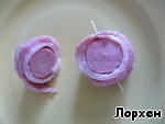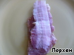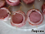 Корейку копченую нарезать тонкими пластинами, положить на кусок мяса, сверху положить кусочек сосиски (длина сосиски зависит от ширины отбитой свинины), а затем свернуть мясо рулетиком.