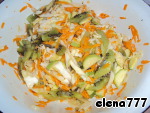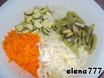 Морковь натереть на крупной тёрке, капусту нашинковать, лук мелко нарезать, кабачки нарезать полукольцами, киви нарезать соломкой.
