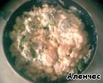Цветную капусту обварить кипятком и перемешать с майонезом, чтобы она полностью была в нем. Переложить в форму, в которой будете запекать.