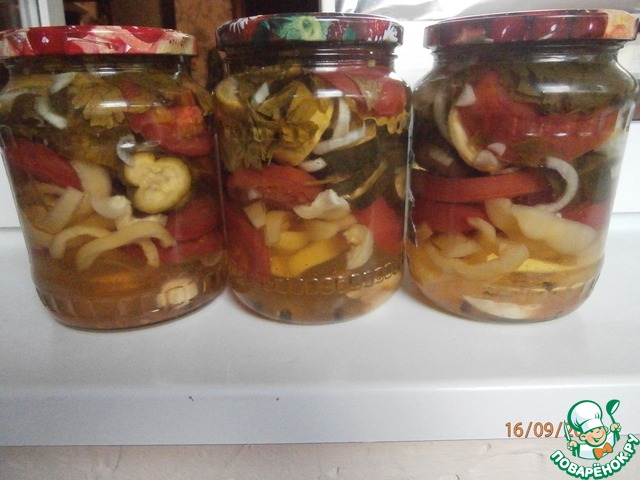 Очень вкусный овощной салат в желе на зиму. В зимнюю стужу откроешь баночку... хрустящие овощи, а вместо рассола - вкуснющее желе... да под рюмашечку... красота! А гости-то как довольны!