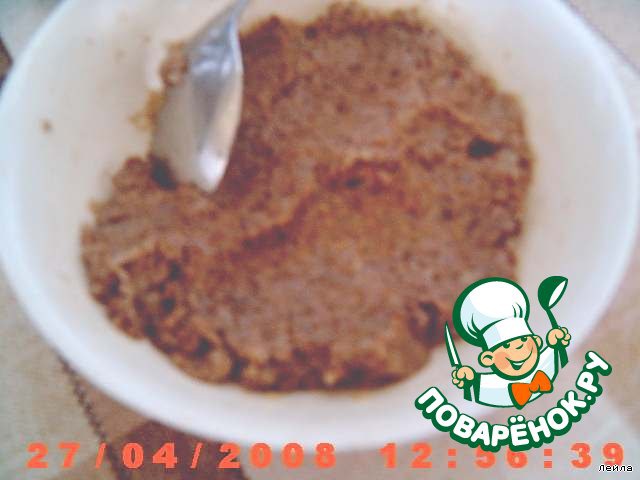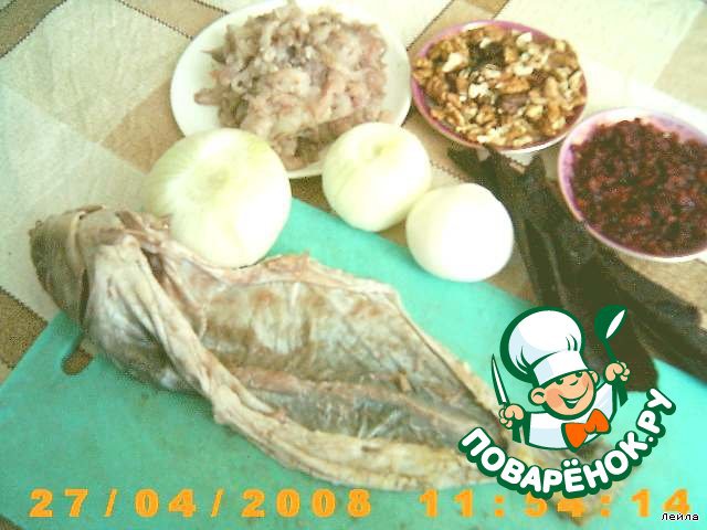 Замочить пастилу. Прокрутить через мясорубку: орехи, лук, от лука выжать сок. Затем мякоть рыбы, в конце пастилу (если, как у меня на картинке, замоченная).