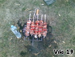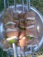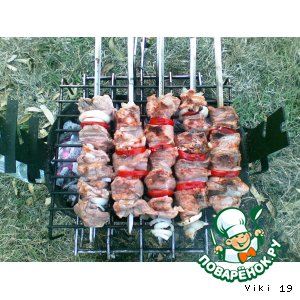 Шампура стоят на сетке, в процессе жарки поливать маринадом + водой, когда с одной стороны будут готовы, перевернуть на другую. На решетке очень удобно переворачивать мясо, никуда не съезжает.