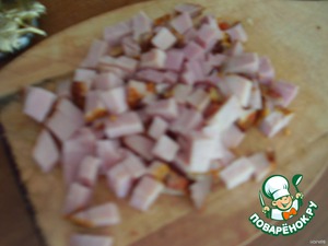 Колбасу нарезать кубиками. Колбасу можно любую, но от копченой добавится более яркий вкус и аромат. Сыр вместе с колбасой всыпать в кипящий супчик.