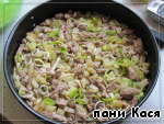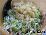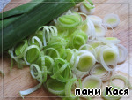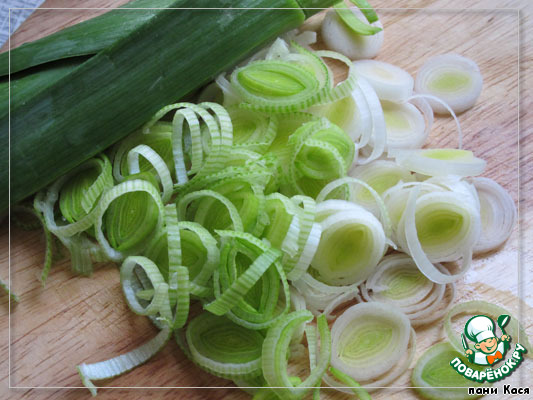 • Белую и кусочек зеленой части лука-порея нарежем кольцами.