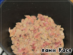 Свинину мелко-мелко порежем, перемешаем со специями, посолим и обжарим практически до готовности. Выложим в миску.