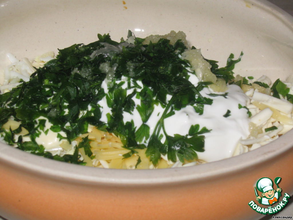 Делаем начинку: для этого трем сыр, яйца. К ним добавляем зелень, майонез и чеснок.