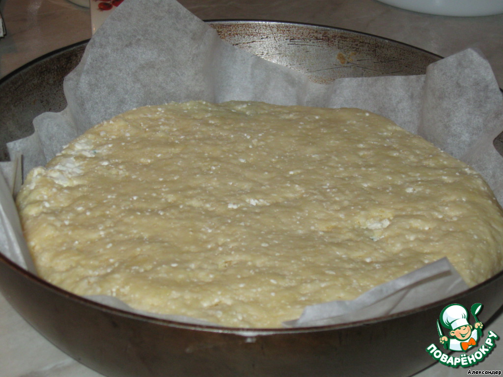 Сковороду выстилаем бумагой для выпечки и выкладываем чуть больше половины теста