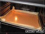 Корж испекся (спичка вынимается сухая). Переворачиваем его на влажное полотенце (вот тут начались проблемы... он ломался), снимаем бумагу.