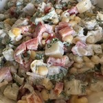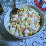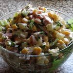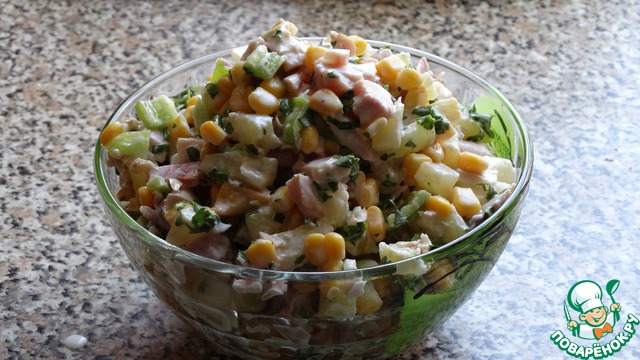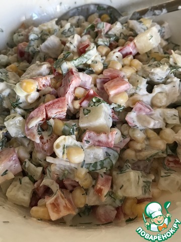 Добавить перец порезанный кубиками (я беру всегда красный, если для гостей, придает колорит блюду, ну а если просто для себя, то можно любой), кукурузу туда же без жидкости и зелень укропа и лука (у меня муж не выносит петрушку... поэтому я ее не беру, но если вы ее любите, то пожалуйста)...