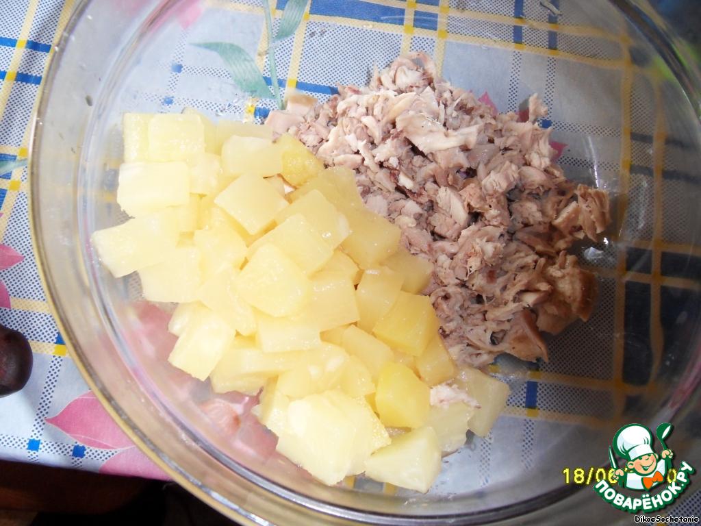 Добавить ананасы без сиропа (если кусочки очень крупные, то можно порезать)...