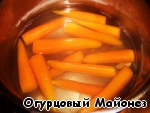 Морковь вместе с чесноком ставим варить в подсоленной воде до готовности (около 20 минут). Чеснок нужен только для аромата, после варки мы его выкинем.