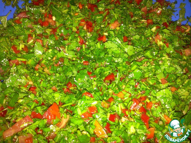 Я делаю этот соус с помощью измельчителя, закладывая петрушку частями, каждый раз добавляя то перец, то помидоры. Добавление к зелени овощей помогает измельчить массу более легко и однородно. Итак, приступим...
