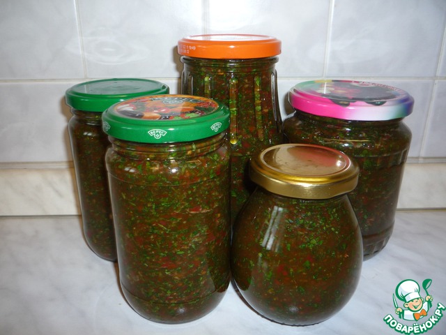 Этот универсальный зеленый соус можно добавлять по вкусу в майонез, сметану, сливочное масло, класть в супы, рагу и овощные салаты. Попробуйте и вы сами найдете ему массу применений! Рецептом поделилась Оля (Лима) на сайте клуба любителей газеты "Скатерть-Самобранка", за что ей большущее спасибо!