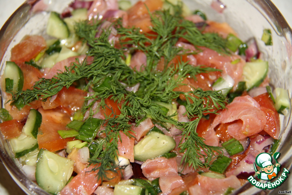 Завтра четверг - рыбный день! Встретим же его во всеоружии! Предлагаю приготовить закусончик из малосольной семги. В ресторане его подавали как салат в большой миске, но мне кажется, что порционно или на кусочке черного хлеба будет пикантнее.