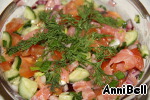 Также мелко нарезаем все остальные овощи и перемешиваем с рыбой. Перчим по вкусу и пробуем на соль. При желании можно чуть подсолить.