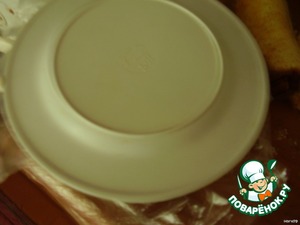 Нарежьте их тонкими колечками. Возьмите круглое блюдо, расстелите на него полиэтиленовый мешочек, а сверху выложите слой рулетов.