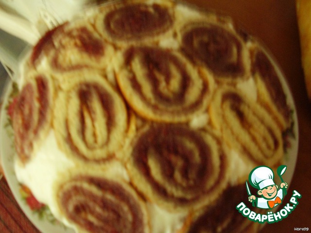 Последний слой - рулеты, смазывать не надо. Прикройте все блюдом большего размера (на котором будет подаваться торт).