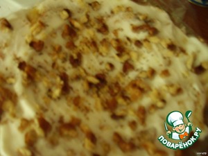 Смажьте взбитыми сливками и покройте слоем бананов, посыпьте грецкими орехами.